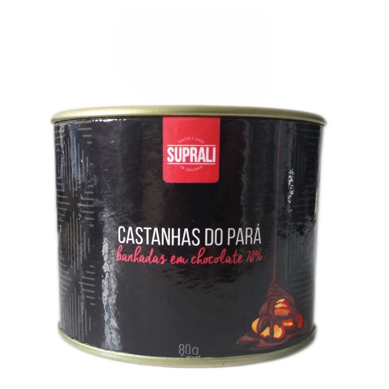 Lata de castanhas do Pará drageadas em chocolate 70% cacau.