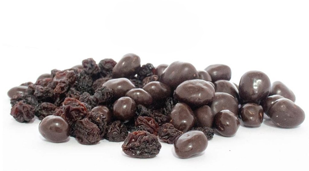Pacote com 200g de uvas passa drageadas em chocolate 70% cacau.